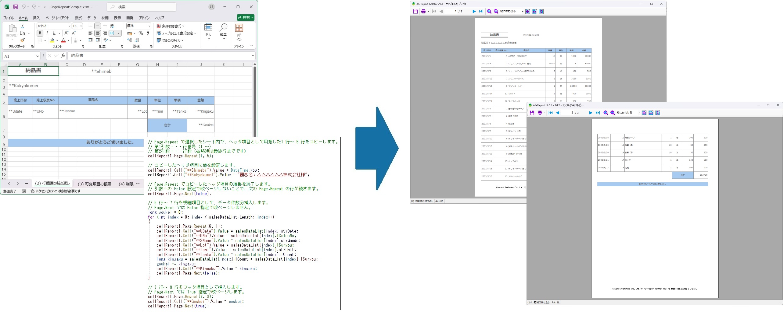 Page.Start - Page.End 機能では、セルに値を設定するだけで Excel で作成したレイアウト通りの帳票を簡単に作成することができます。
