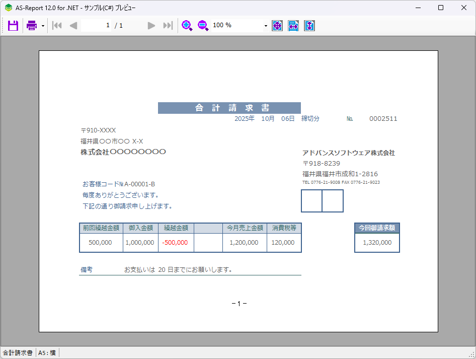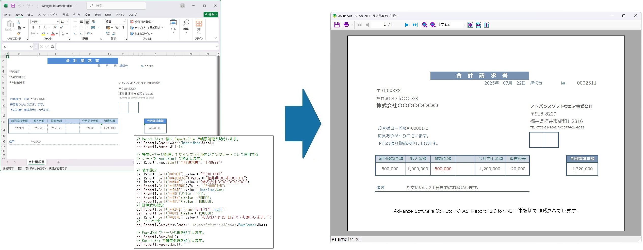 // デザインファイル名を指定し、帳票作成を開始します。cellReport1.FileName = @"C:\Book1.xlsx";cellReport1.Report.Start();cellReport1.Report.File();// 帳票のページごとにシートを指定して編集を行います。cellReport1.Page.Start("Sheet1", "1");cellReport1.Cell("A1").Value = "アドバンスソフトウェア株式会社";cellReport1.Page.End();// 帳票作成を終了します。cellReport1.Report.End();// 作成した帳票を Excel ファイルとして保存します。cellReport1.Report.SaveAs(@"C:\out1.xlsx");