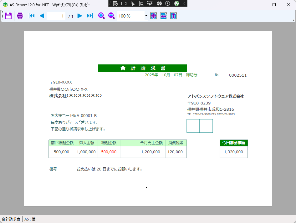 // デザインファイル名を指定し、帳票作成を開始します。cellReport1.FileName = @"C:\Book1.xlsx";cellReport1.Report.Start();cellReport1.Report.File();// 帳票のページごとにシートを指定して編集を行います。cellReport1.Page.Start("Sheet1", "1");cellReport1.Cell("A1").Value = "アドバンスソフトウェア株式会社";cellReport1.Page.End();// 帳票作成を終了します。cellReport1.Report.End();// 作成した帳票を Excel ファイルとして保存します。cellReport1.Report.SaveAs(@"C:\out1.xlsx");
